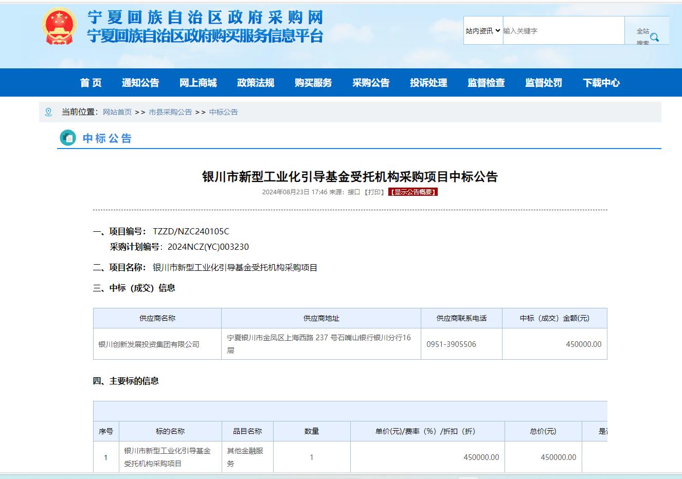 8月23日,銀川創(chuàng)投集團(tuán)中標(biāo)銀川市新型工業(yè)化引導(dǎo)基金受托機(jī)構(gòu)采購項目。